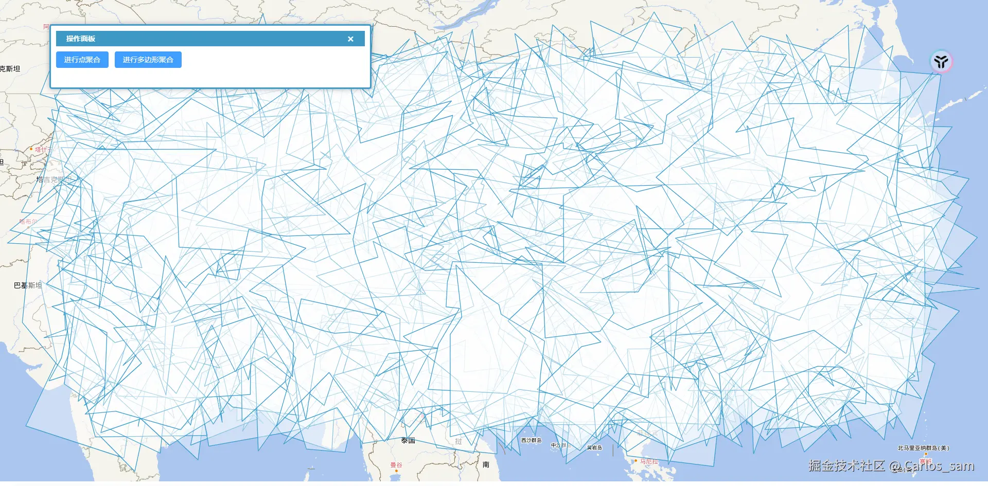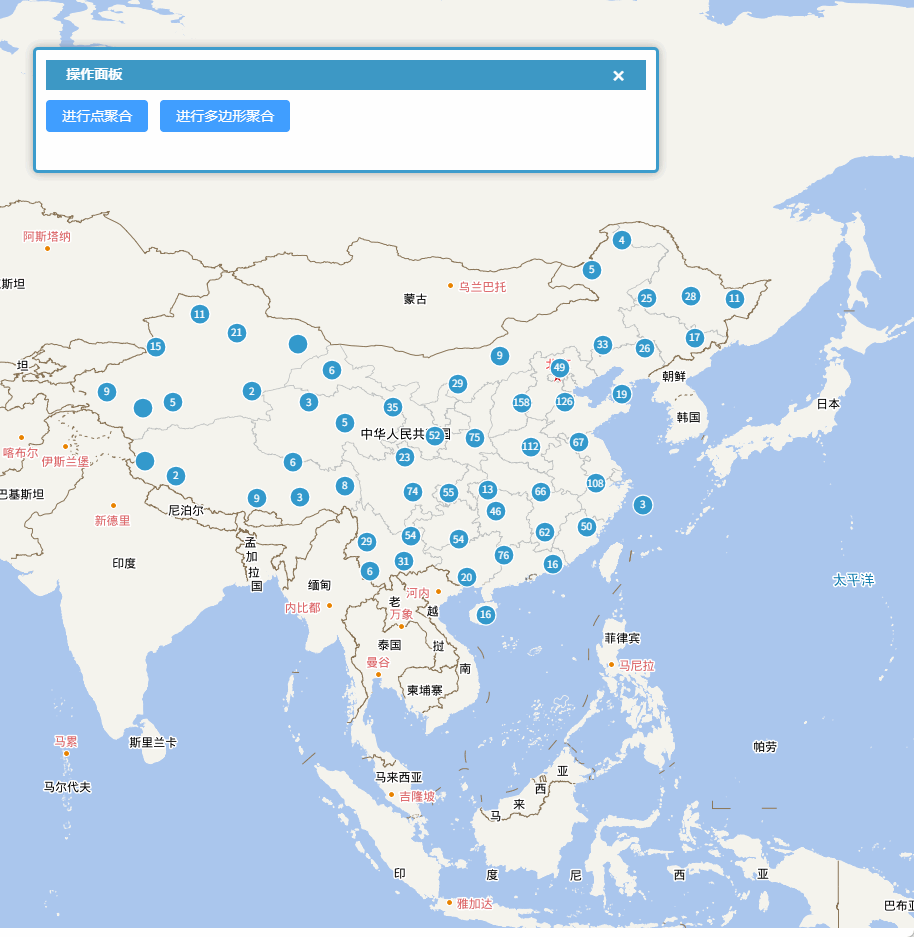 如果需要进行聚合的是点以外的其它图形,例如多边形,那么就必须设置geometryFunction属性,以指定用于聚合计算的点。对于多边形来说我们可以使用Polygon.getInteriorPoint()方法获取多边形的中心点来进行聚合计算。