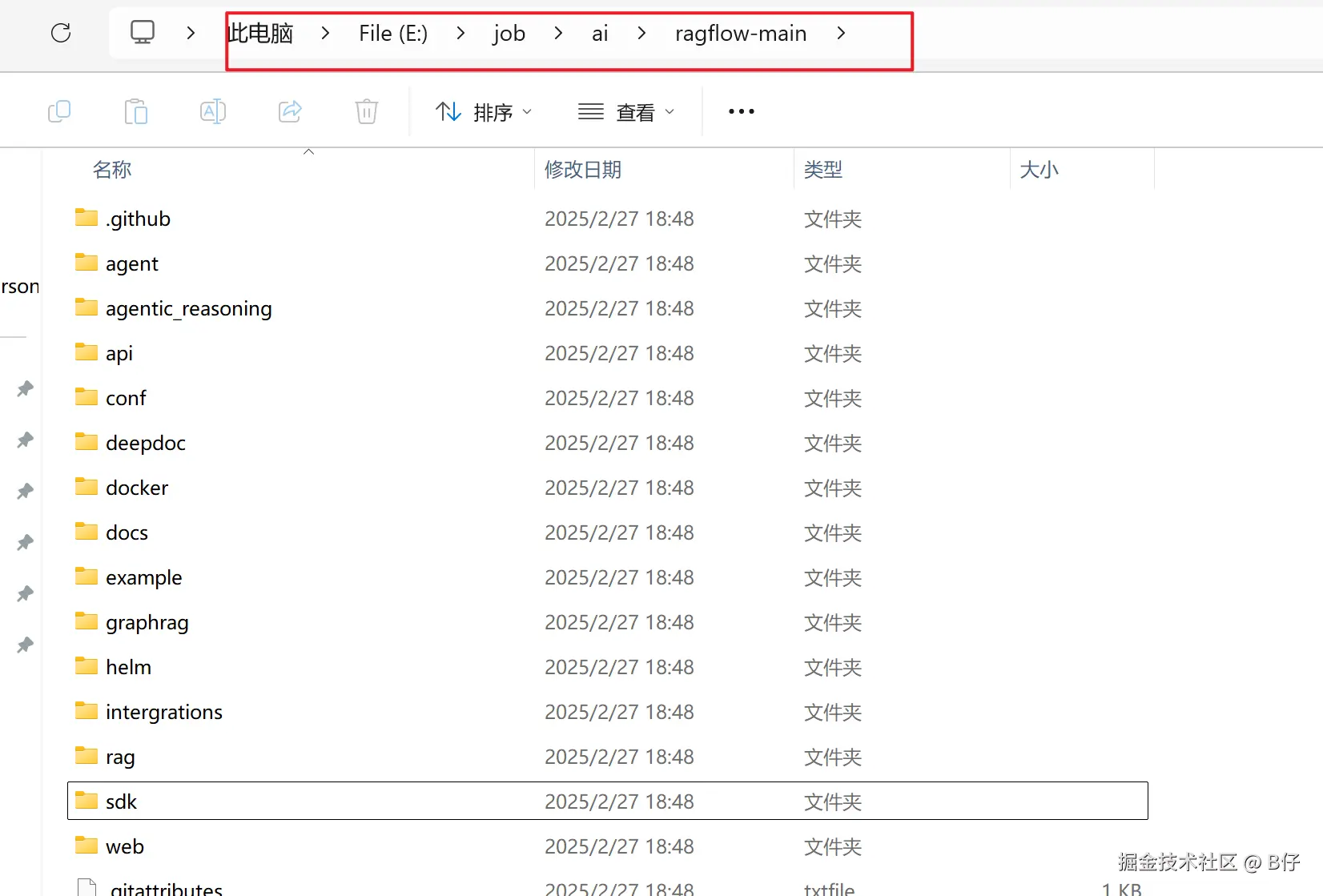进入到刚才下载完成的 ragflow-main 文件夹下,文件夹路径输入 cmd,复制一下命令到 cmd 执行