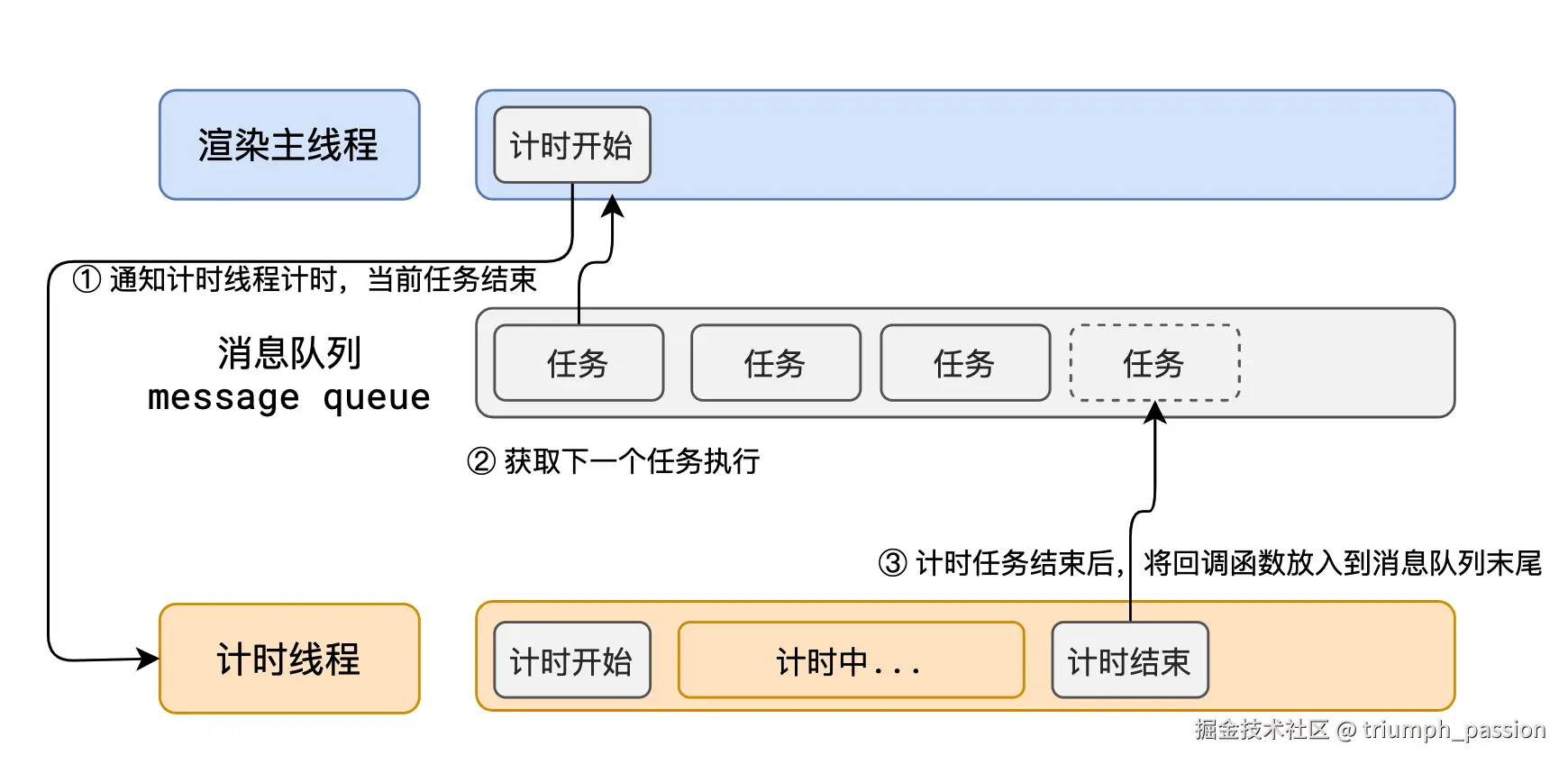 在 Chrome 的源码中,它开启一个不会结束的 for 循环,每次循环从消息队列中取出第一个任务执行,而其它线程只需要在合适的时候将任务加入到队列末尾即可。