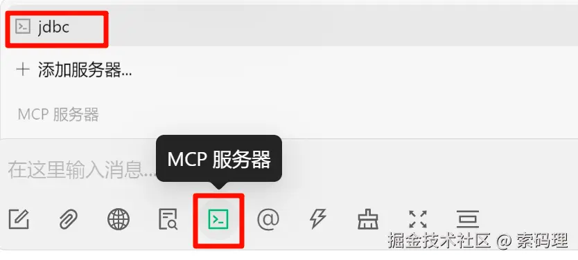 对话框界面选择MCP服务器 ,选择刚才添加的MCP 服务端,然后就可以进行对话了。