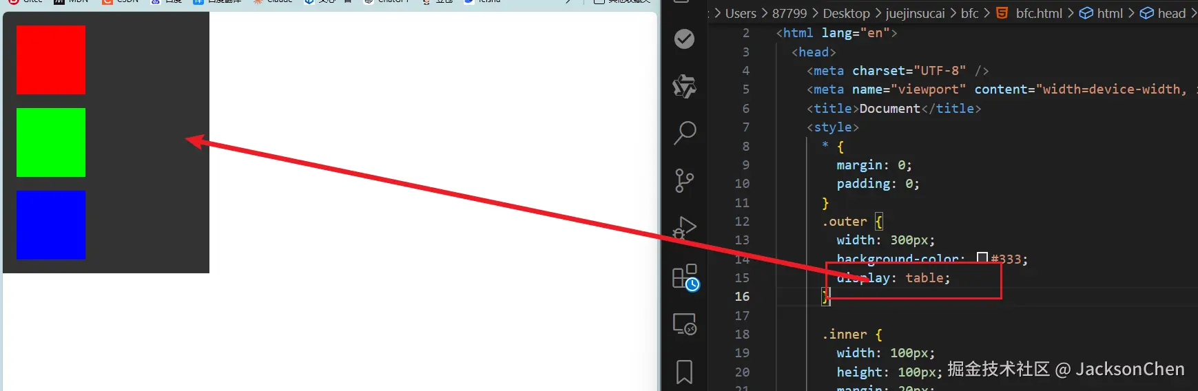 我们看到正常情况是这个样式,然后开启margin塌陷,给inner加上 margin: 20px;,如图所示,造成了margin 塌陷,然后我们分别使用下面的方法来解决一下,剩余两个好处一样,就不展开举例了。大家可以自己下去试试。