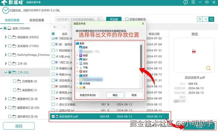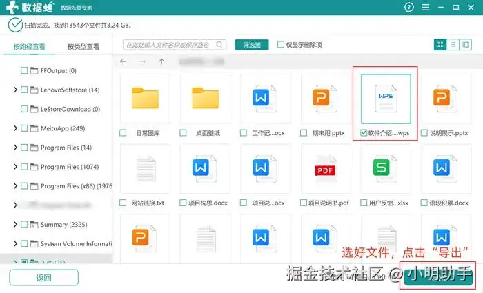 第2步:在指定位置上选择需要恢复的U盘文件,单击图标后表示勾选,点击“导出”;