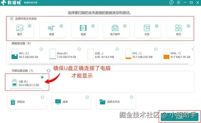 第1步:在软件首页上选择丢失文件类型和U盘(需要用户提前将U盘插入电脑中并且连接成功),点击“扫描”;