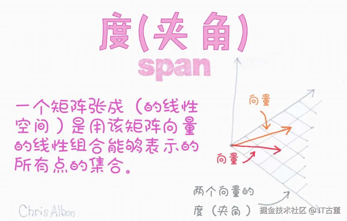 今天我们就借助一张生动直观的手绘图,来全面理解“张成空间”的几何意义,并从图中扩展出一个更常见的问题:向量之间的夹角(或称“度”)在空间中的角色。