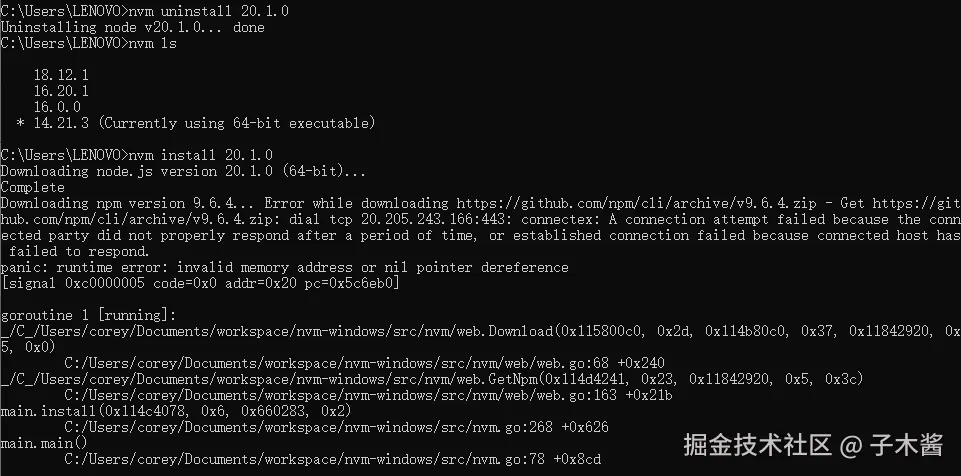 8、此时我们使用nvm切换到20.1.0版本的node,查看npm版本的时候,会出现错误