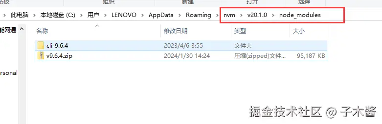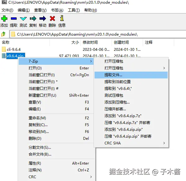 6、然后在解压软件中将npm包解压出来,再强调一遍,记得将解压出来的文件【cli-9.6.4】改名成【npm】