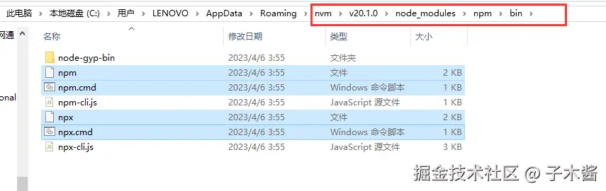 7、然后进到npm文件夹下的bin文件夹中,将里面的四个文件拷贝出来,如图所示