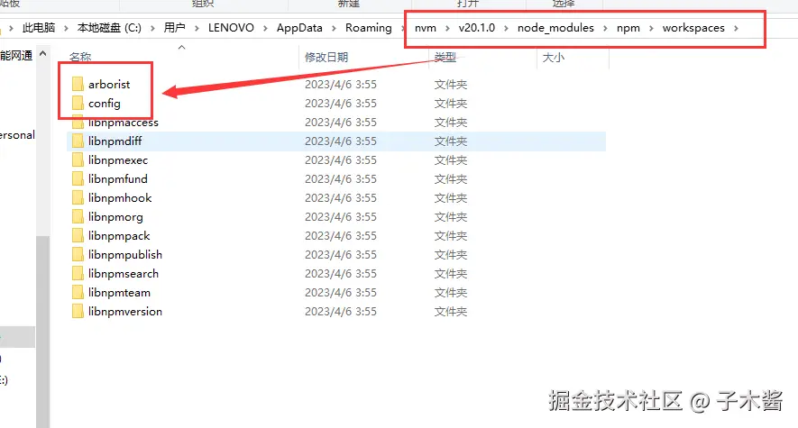 9、找到 workspaces 中的对应文件,拷贝到对应的文件夹下,不同版本的文件有些不同,有些没有config文件,arborist和config拷贝到 node_modules/@npmcli,其他的拷贝到 node_modules 下,记得拷贝前,将链接先删掉