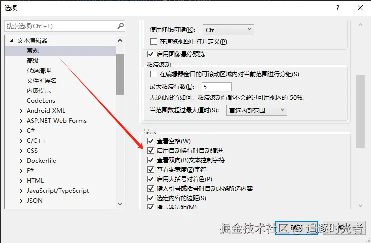 - 设置位置:工具 -> 选项 -> 文本编辑器 -> 常规 -> 启用自动换行时自动缩进的选项