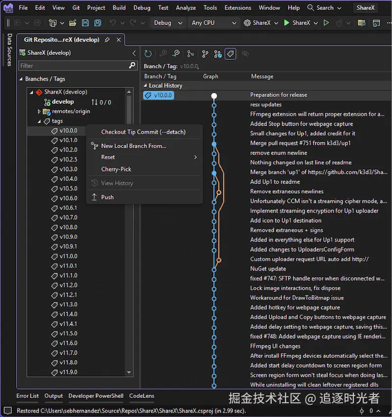 现在 Visual Studio 2022 支持在 Git 存储库窗口中直接无缝查看和管理 Git 标记。轻松导航到与标签关联的特定提交,并访问一个上下文菜单,其中包含可以在标记上执行的操作。这种简化的工作流可确保你保持在熟悉的 IDE 环境中,从而提高使用 Git 标记时的生产力和效率。