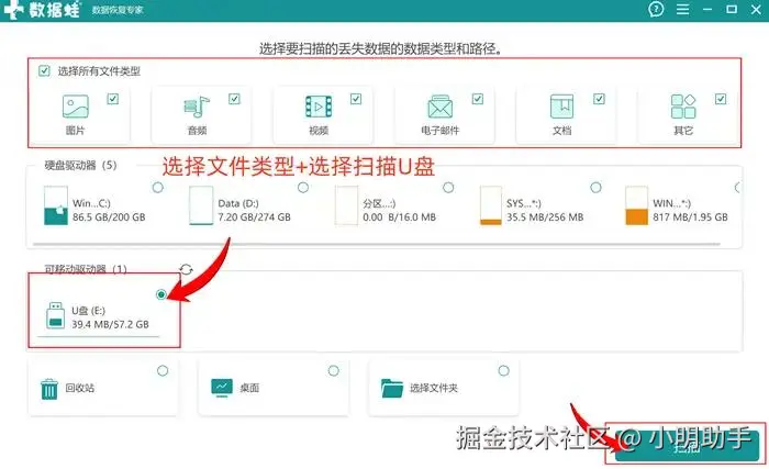 第1步:在电脑中打开数据 蛙恢复专家,在首页选择文件类型和U盘,点击【扫描】后耐心等待;