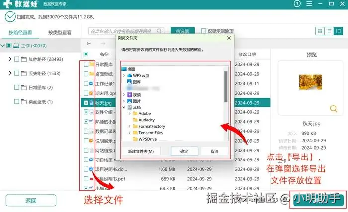 第2步:在扫描出来的文件中选择自己需要找回的文件,勾选后点击【导出】;在弹窗中选择U盘之外的电脑位置存储导出文件即可。