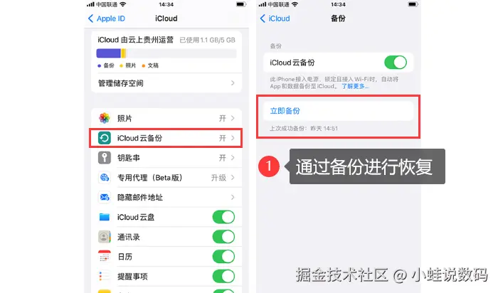 操作方法:进入手机的【设置】中,在【iCloud云备份】里抹掉设备上的数据和设置。在设备上重新设置iCloud账户,并选择【从iCloud备份恢复】,选择最近的备份进行恢复,等待恢复完成。