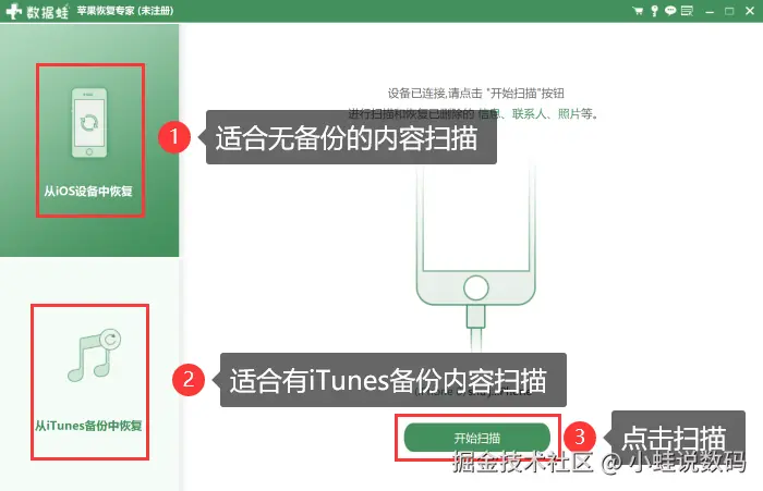 步骤1:连接你的iPhone和电脑,启动软件并根据实际情况选择合适的扫描模式。没备份的微信聊天记录怎么找回?我们可以选择【从iOS设备中恢复】的模式,点击【开始扫描】,等待扫描完成。