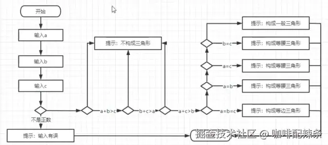 中学教学软件提供一个功能,用户可输入三个数,系统校验这三个数。若为正数,判断能否构成三角形,否则提示输入有误;若能构成三角形,进一步判断是否为等边三角形、等腰三角形或一般三角形,并给出相应提示。根据此功能描述,绘制业务流程图并编写测试用例,涵盖输入非正数、构成不同类型三角形等各种情况。
