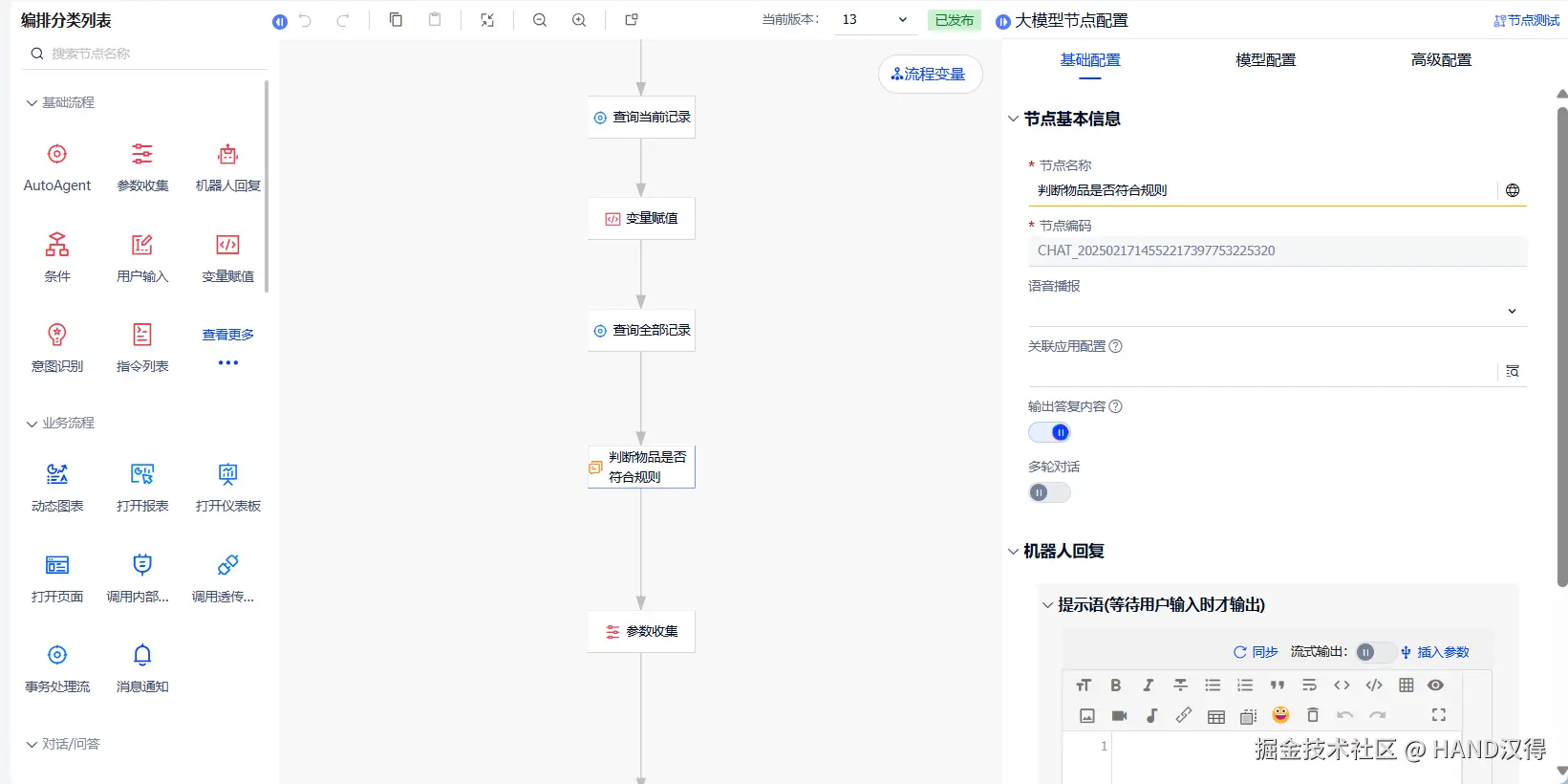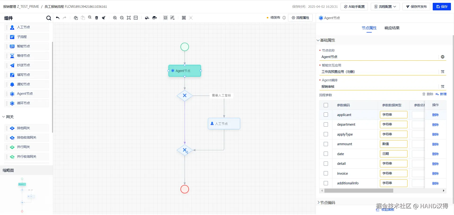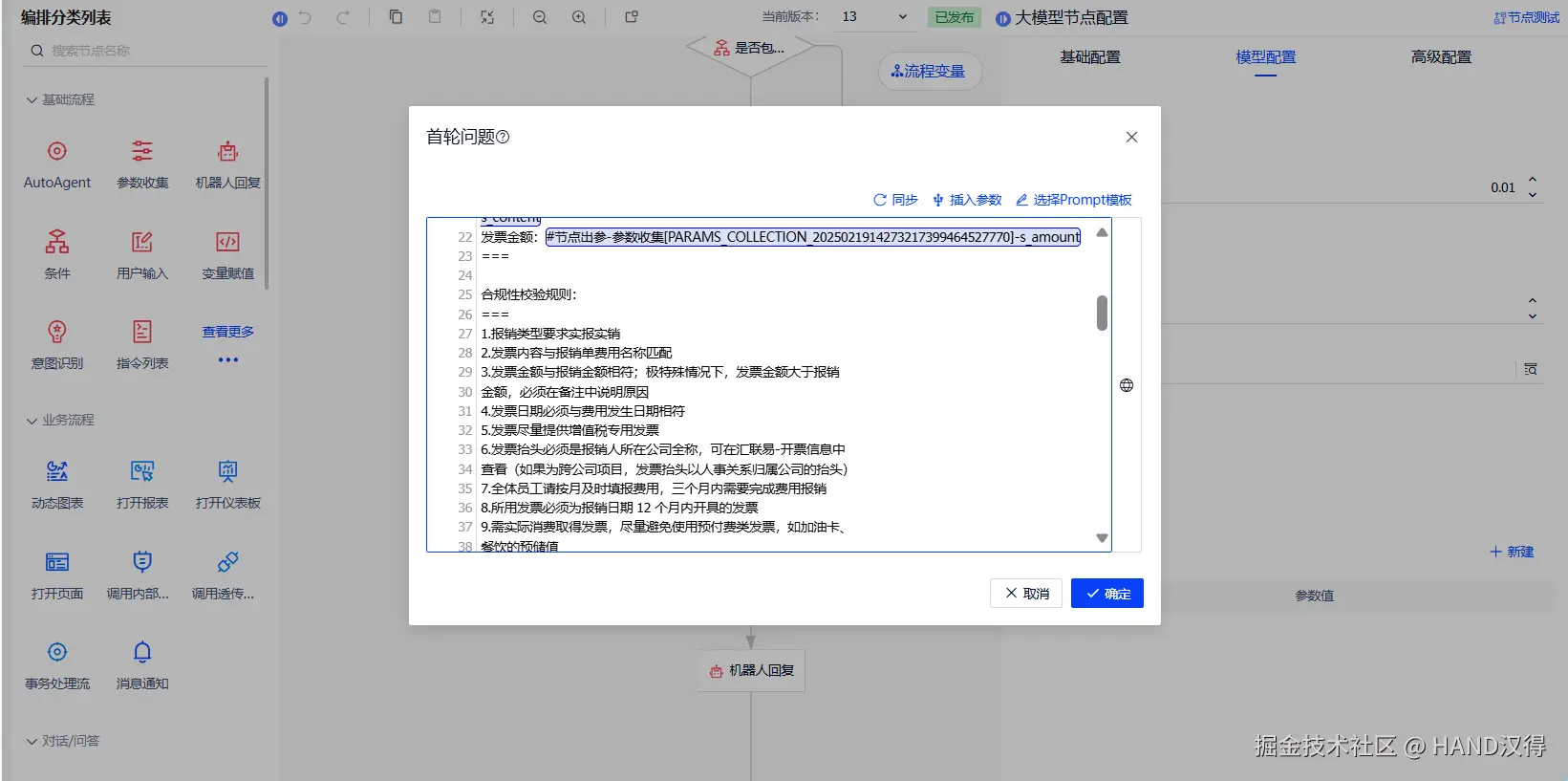 我们以员工费用报销流程为例,介绍如何在流程中使用Agent节点,Agent节点配置主要分为两部分: