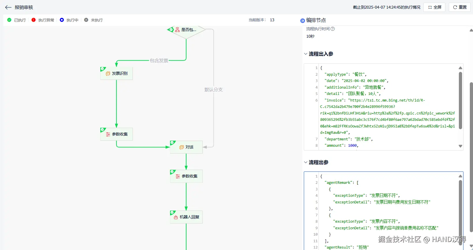2. 提交流程后,Agent节点根据预置报销政策判断报销内容是否合理,并自动拒绝不合理报销单。例如发票内容与报销事项不匹配等