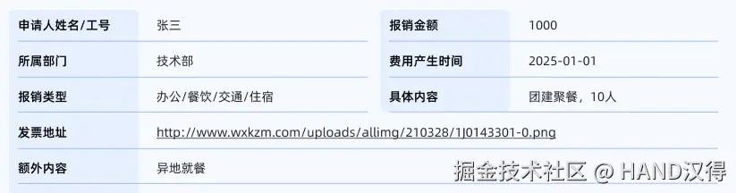 示例中,选择了预置的Agent【报销管理】,选择后系统自动带出该单据所需入参,包含申请人、所属部门、报销类型、发票地址等信息。