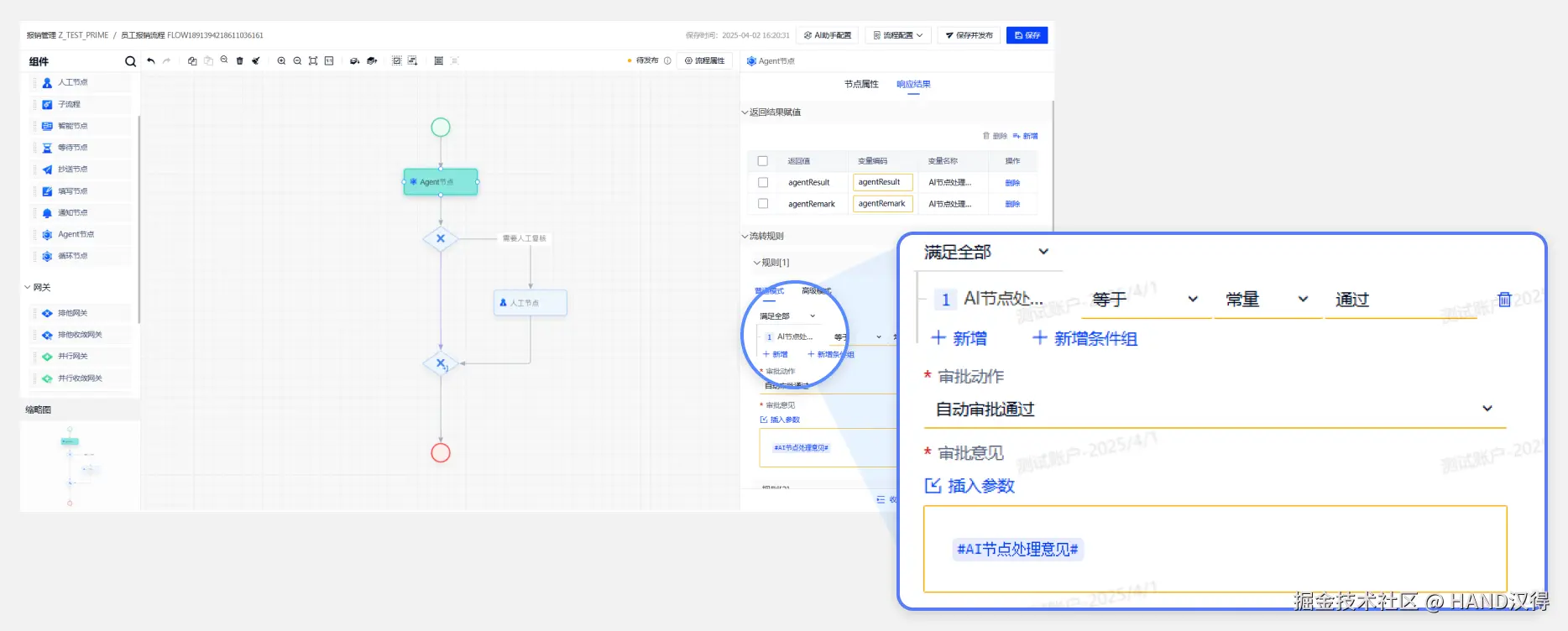 我们选择流程变量AI节点处理结果和AI节点处理意见存储Agent节点处理结果,并配置流转条件。
