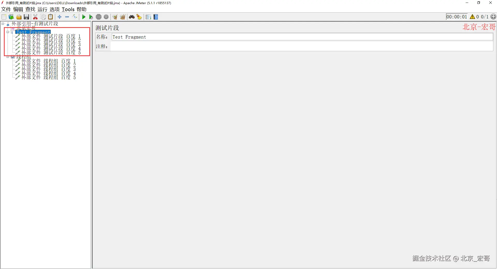 1、首先创建一个外部引用有测试片段的测试计划,如下图所示: