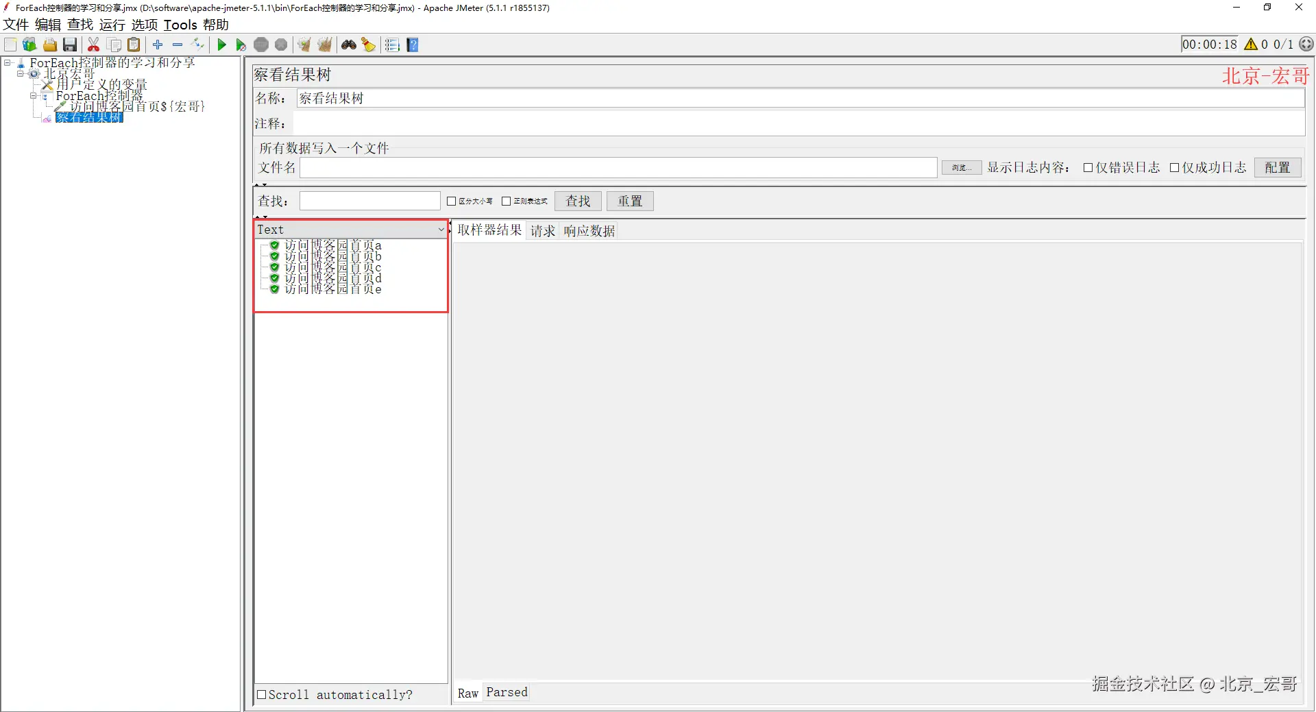 3、运行JMeter,查看结果树(执行完控制器里的测试片段,再继续向下执行 访问博客园首页 的取样器),如下图所示: