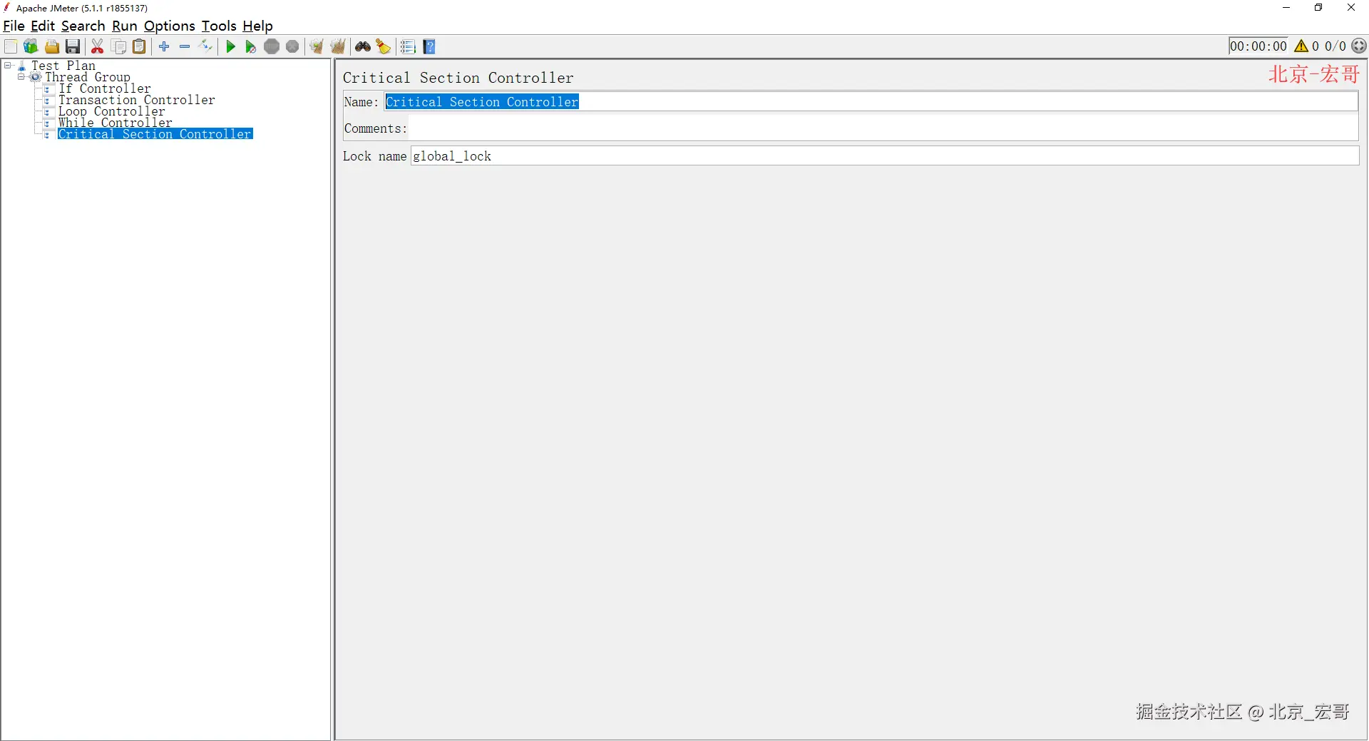 宏哥这个二把刀的翻译,给你们翻译一下这段鸟语看看到底是什么意思,大致意思是: Critical Section Controller(临界区控制器),确保它的子元素(samplers /控制器等)在执行控制器的子程序之前只执行一个线程作为指定的锁。呵呵!看到这句话是不是觉得一头雾水啊,摸一摸自己所剩无几的头发陷入沉思中.....没有关系的,不要纠结了,宏哥后边会用具体实例讲解一下,看完实例后,再回过头来阅读这句话,你就会恍然大悟了。