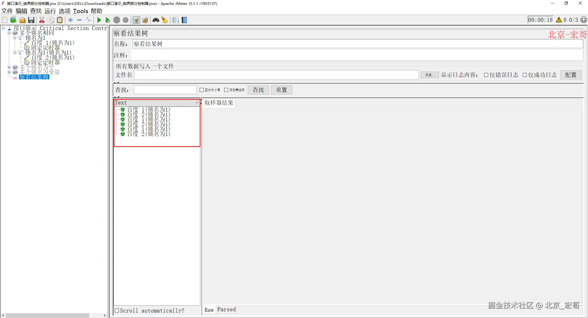 3、从上个图,查看结果树中显示请求结果数据不是按照顺序请求,不符合预期,这个时候增加一个critical section controller(临界部分控制器),增加一个锁,就能控制执行顺序。如下图所示: