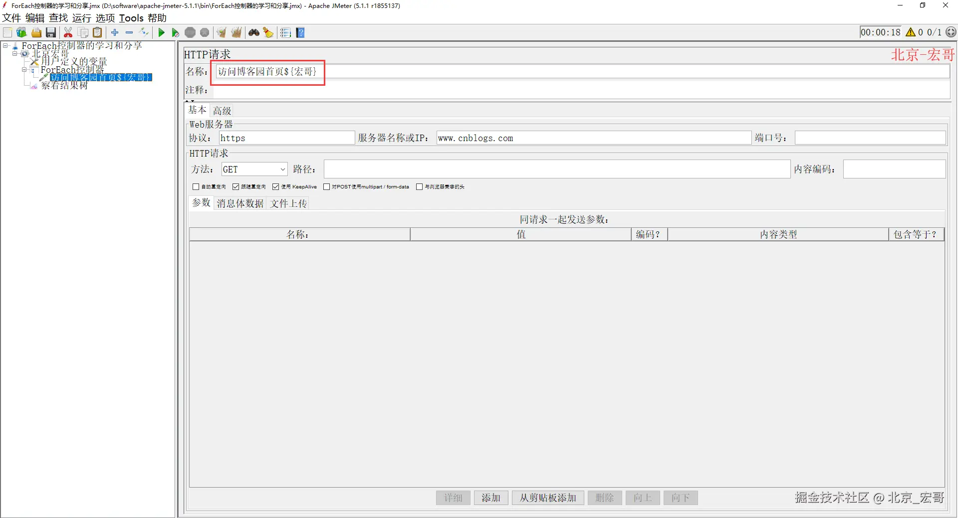 3、添加请求 访问博客园首页 + 输出值:{宏哥} 取到输出变量的值,如下图所示: