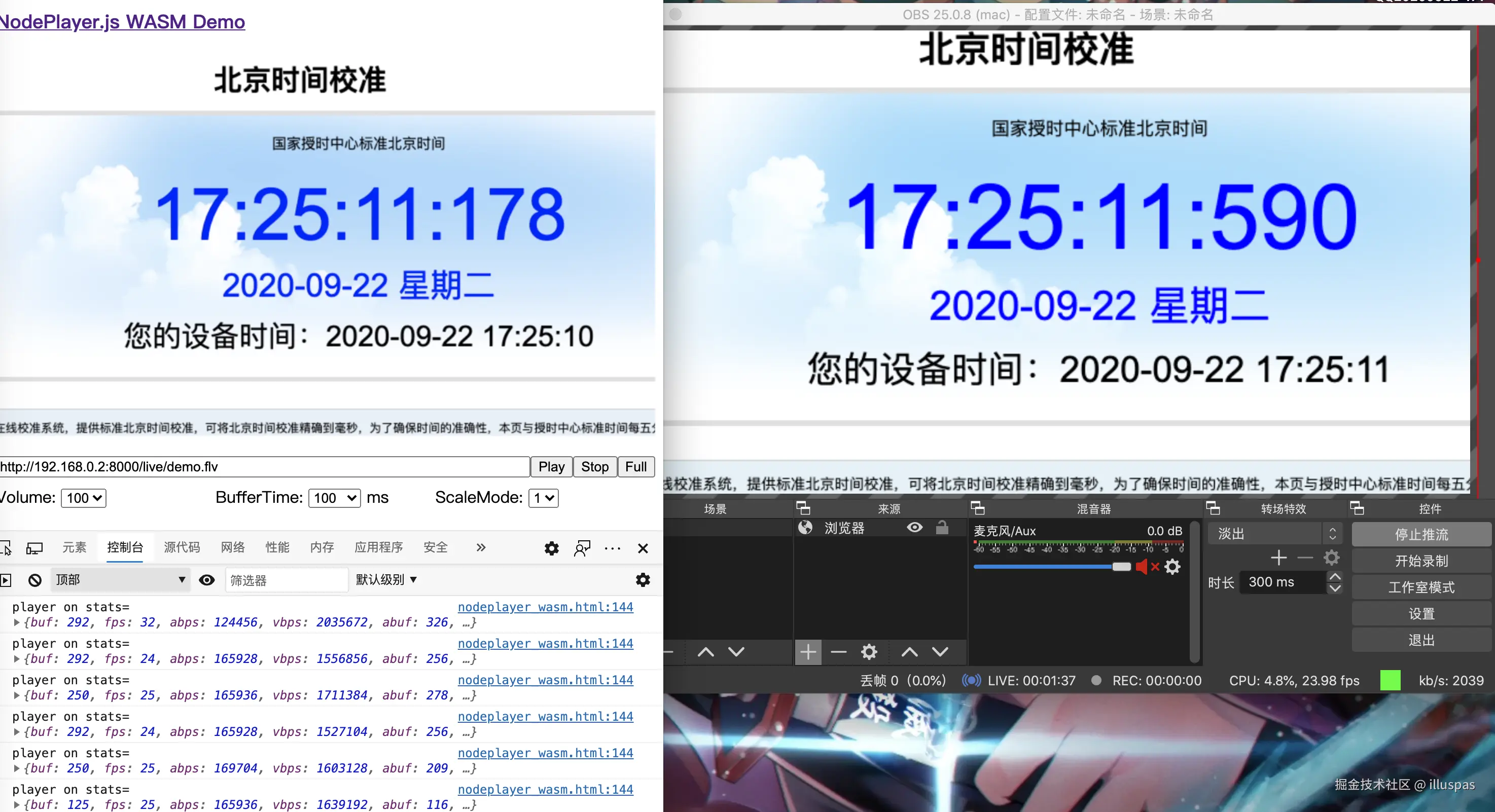 OBS推流到局域网NMSv3,使用NodePlayer.js_v0.5.45-wasm版,bufferTime设置为100 毫秒,实测延迟400毫秒。低于1秒,达到毫秒级低延迟。