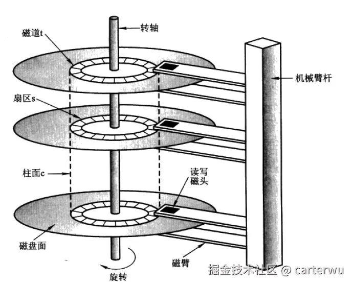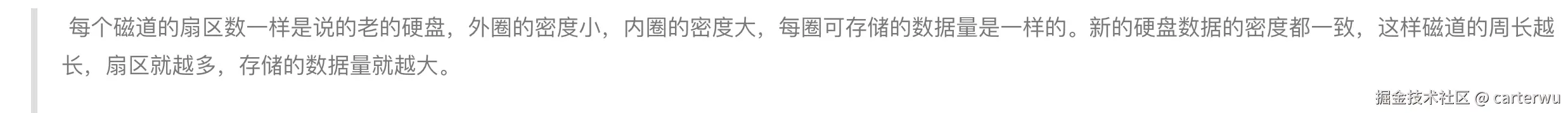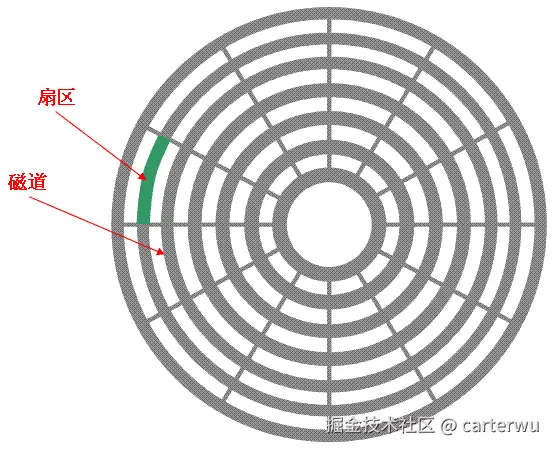物理层面,一个磁盘按层次分为:磁盘组合 -> 单个磁盘 -> 某一盘面 -> 某一磁道 -> 某一扇区 。每个磁盘有多条同心圆似的磁道,磁道被分割成多个部分。每部分的弧长加上到圆心的两个半径,恰好形成一个扇形,所以叫做扇区。扇区是磁盘中最小的物理存储单位。