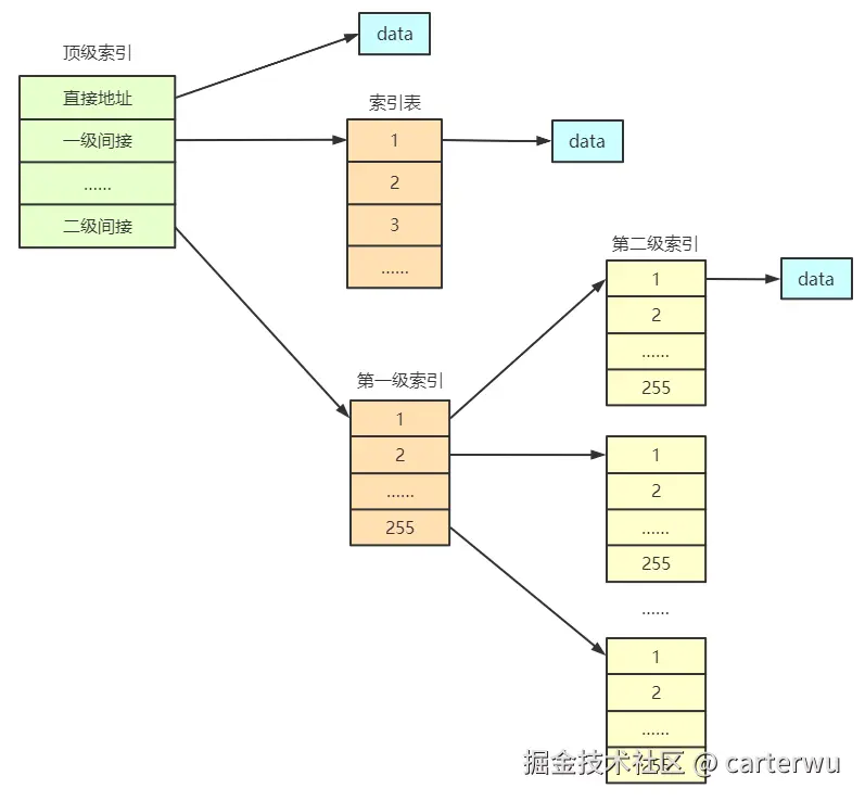 使第一层索引块指向第二层的索引块,还可根据文件大小的要求再建立第三层、第四层索引块。