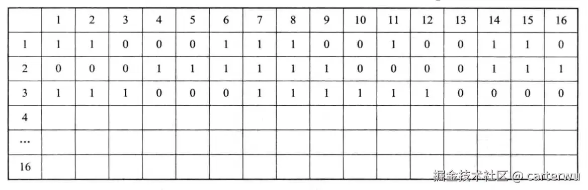 位示图是利用二进制的一位来表示磁盘中一个盘块的使用情况,当其值为 0 时表示对应的盘块空闲,为 1 时表示已分配,也可以反过来。磁盘上的所有盘块都有一个二进制位与之对应,这样由所有盘块所对应的位构成一个矩阵。通常可用 m x n 个位数来构成位示图,并使 m x n 等于磁盘的总块数,描述为一个二维数组 map[m,n]。