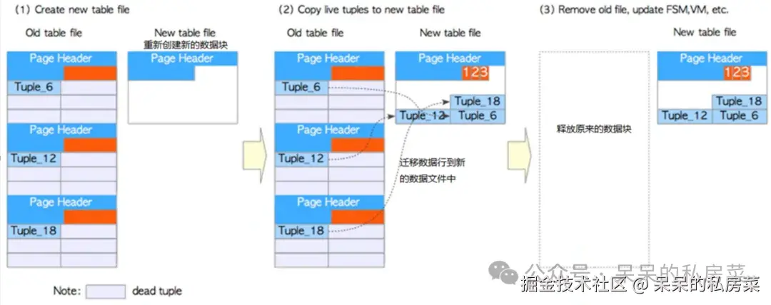 - 通过把dead tuple空间之外的内容写成一个完整的新版本表来主动紧缩表,这会最小化表的大小,但是需要花费较长时间;