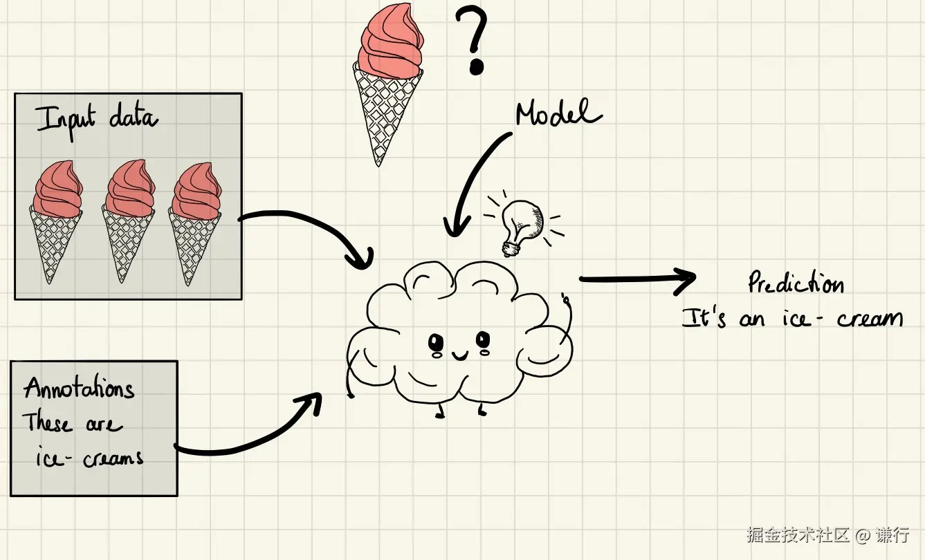 两张好玩的图片帮大家理解监督学习与无监督学习,不断给婴儿看各种各样冰激凌的图片,让其分辨下一张是不是冰激凌,这是监督学习
