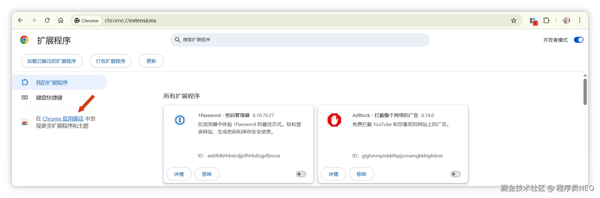 找到“在 Chrome 应用商店中发现更多扩展程序和主题”,点击进入: