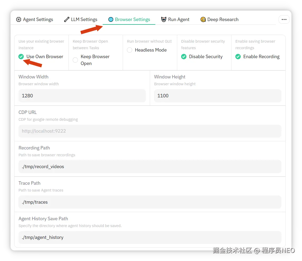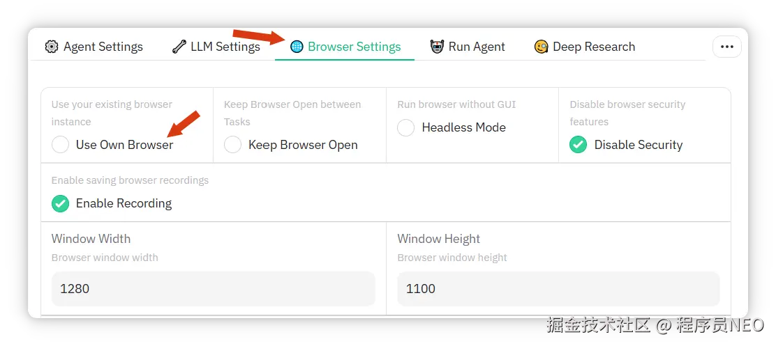 在 browser Settings 选项卡,勾选 Use Own Browser,即使用本机 Chrome:
