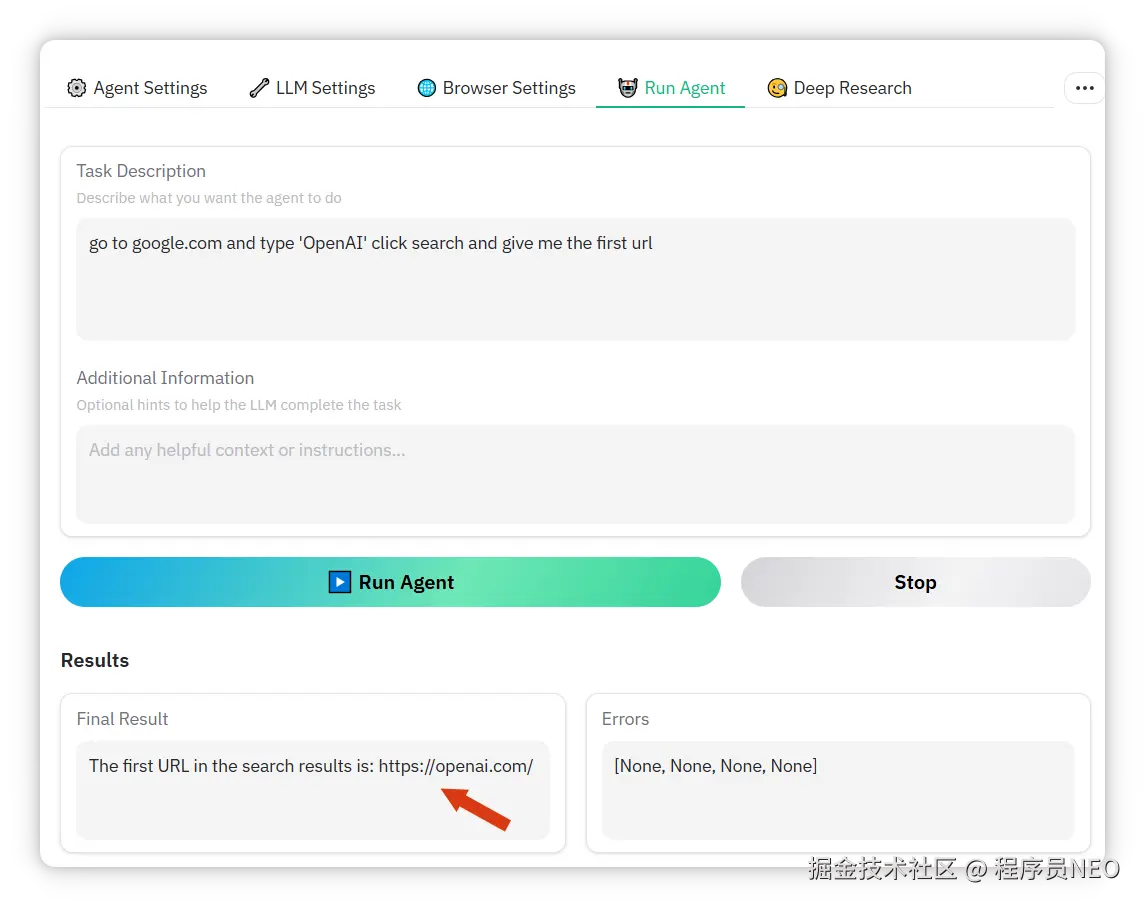 官方预设任务(访问 google.com,输入 “OpenAI”,点击搜索,返回第一个网址),直接点击 Run Agent 测试。