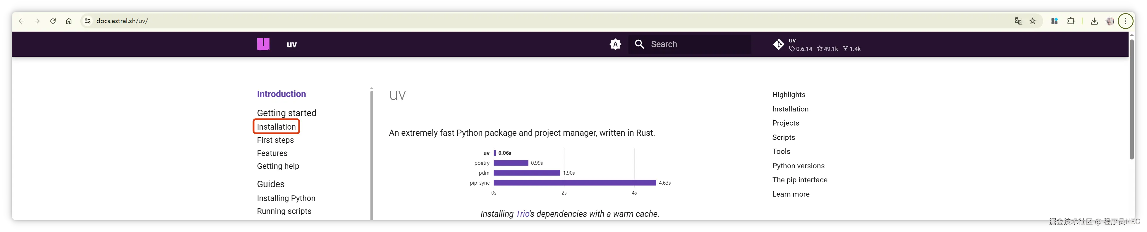 在 UV 官网左侧菜单栏找到 Installation: