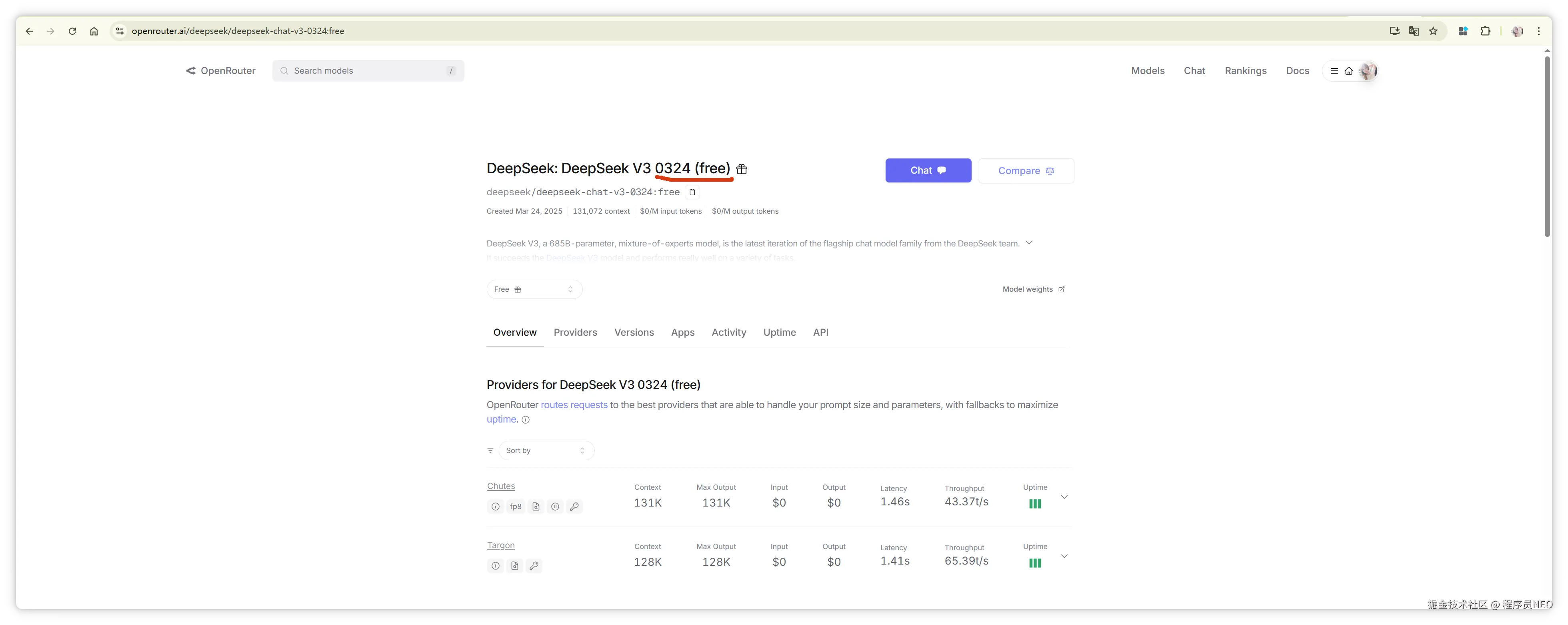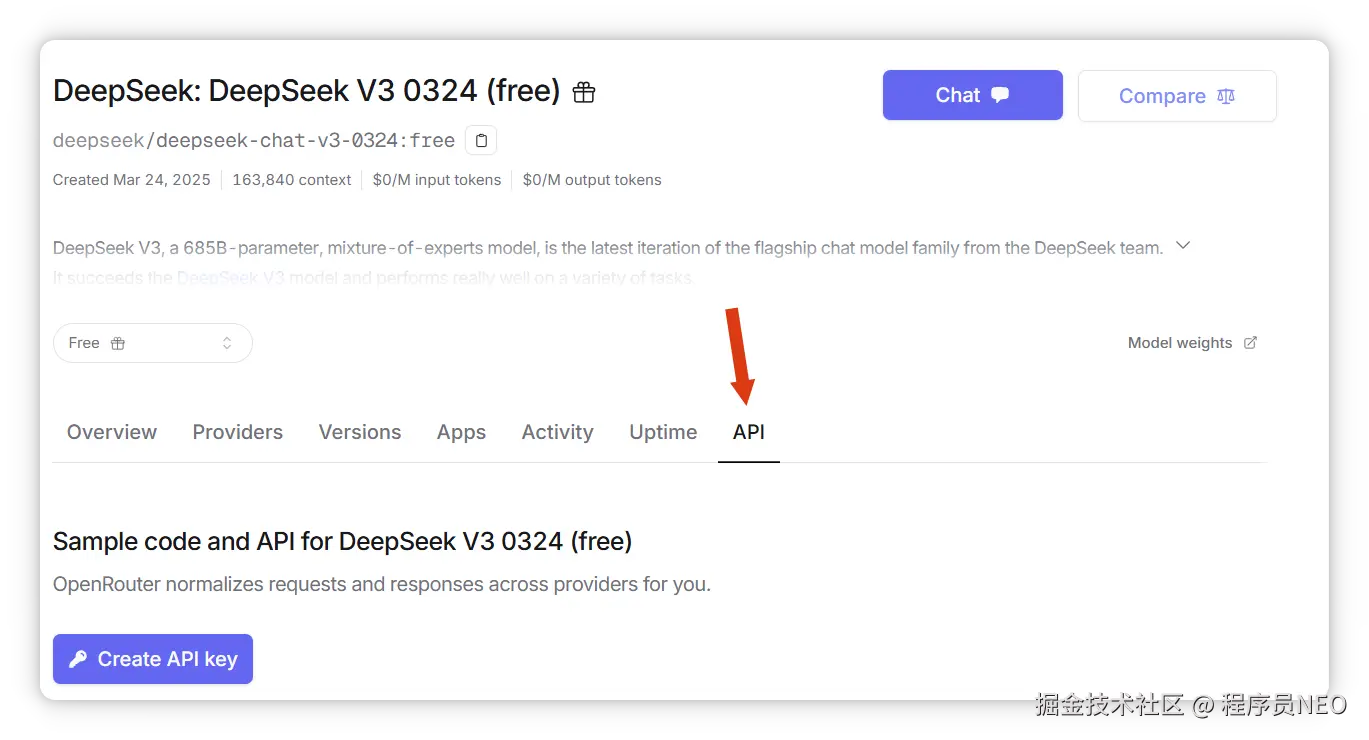 本文使用 DeepSeek V3 免费版,在 OpenRouter DeepSeek V3 0324(free)模型详情页 OpenRouter