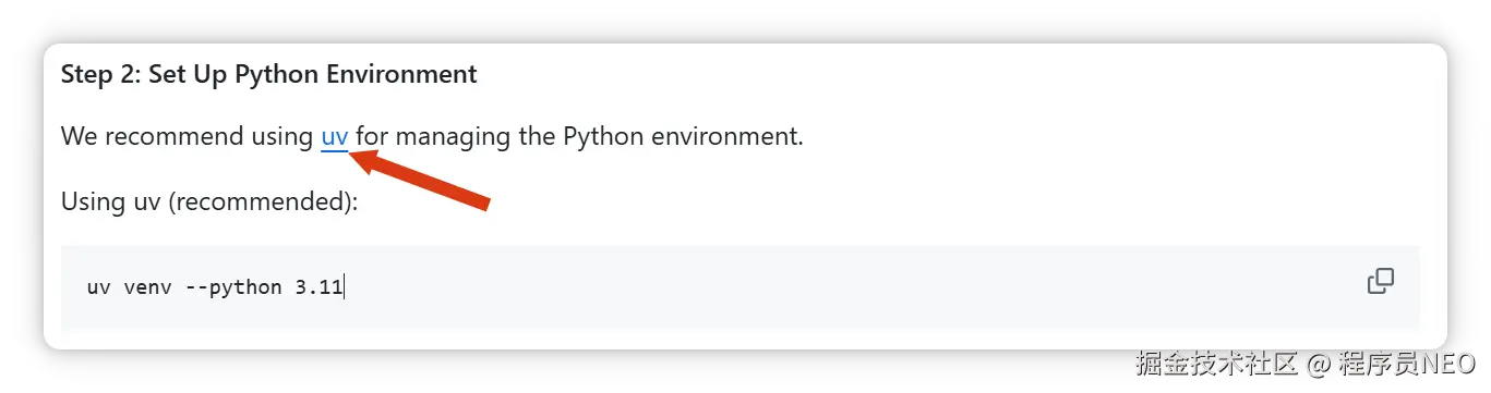 下一步是配置 Python 运行环境。官方推荐使用 UV 工具: