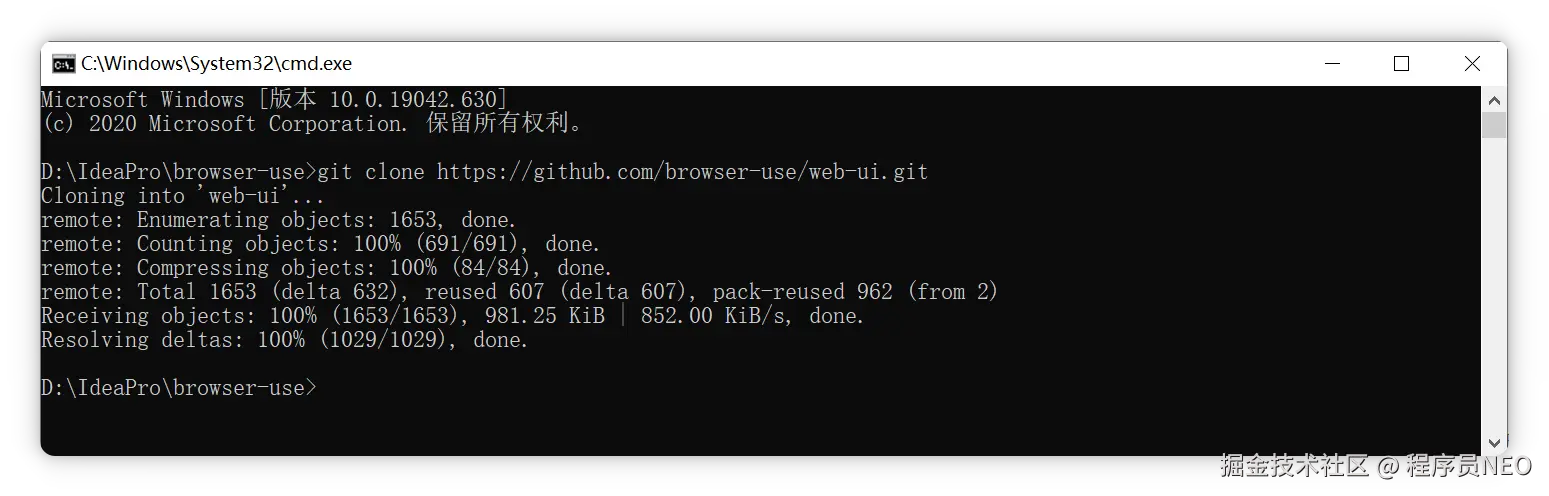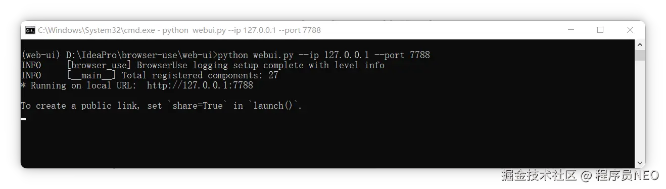 然后在 browser-use 文件夹内打开命令提示符(可在地址栏输入 cmd 回车,或右键菜单打开,或通过 Windows 搜索栏搜索 cmd 后 cd 到该目录),执行以下命令: