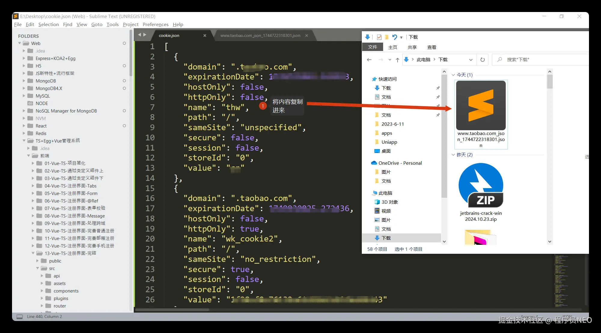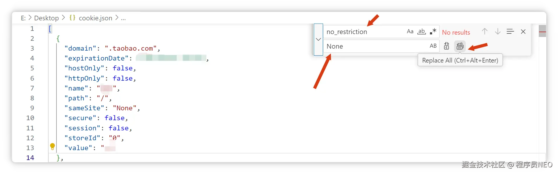 此时我在电脑桌面上新建了一个 cookie.json 文件,然后用编辑软件打开,把刚才用 Cookie Editor 导出的 JSON 信息粘贴到这个文件中: