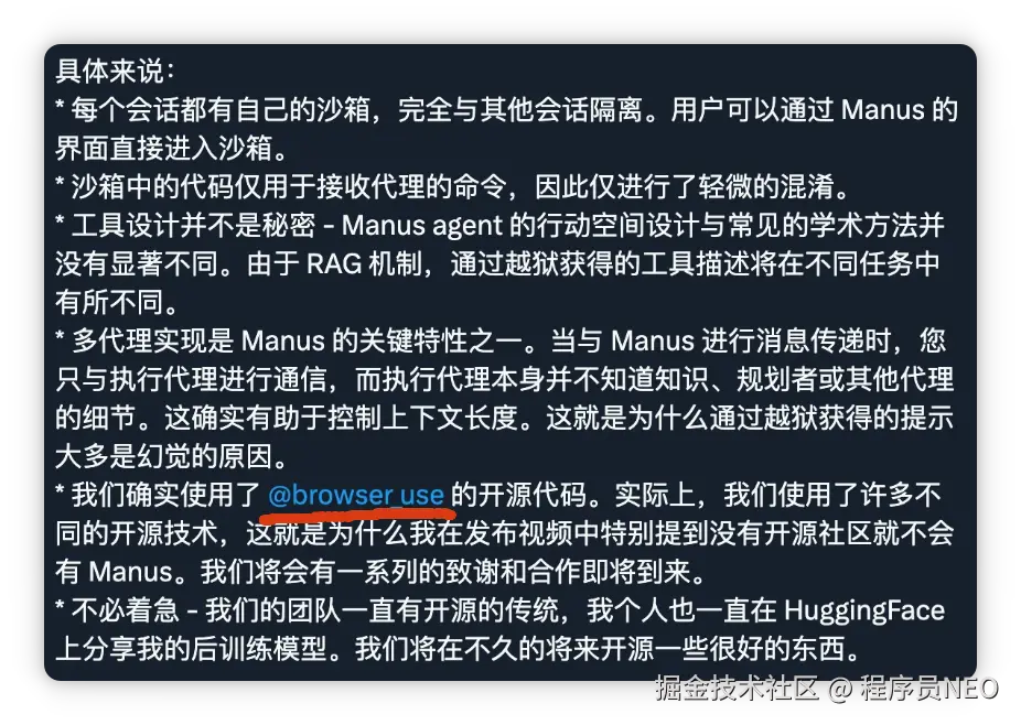 近期大热的 AI 产品 Manus 也选择了 Browser use 作为核心组件。随后,Manus 联合创始人 @peakji 也公开证实,确实采用了 @browser_use 的开源代码。