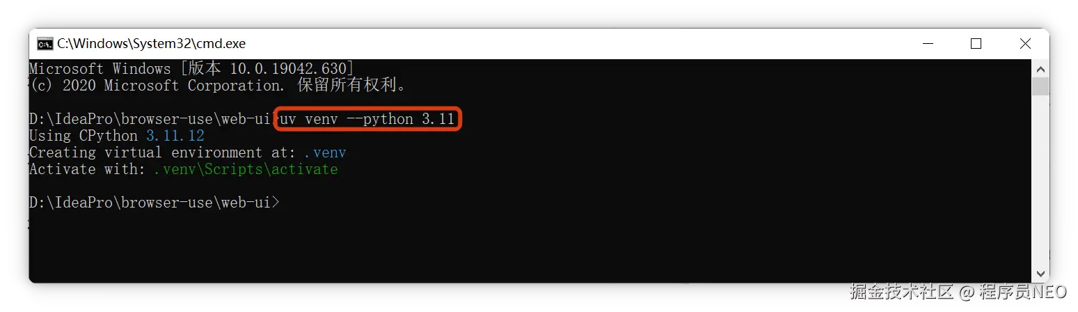 安装完成后,继续操作。已进入 web-ui 文件夹目录,在命令窗口(如遇命令找不到需重开窗口),使用 UV 创建 Python 3.11 运行环境: