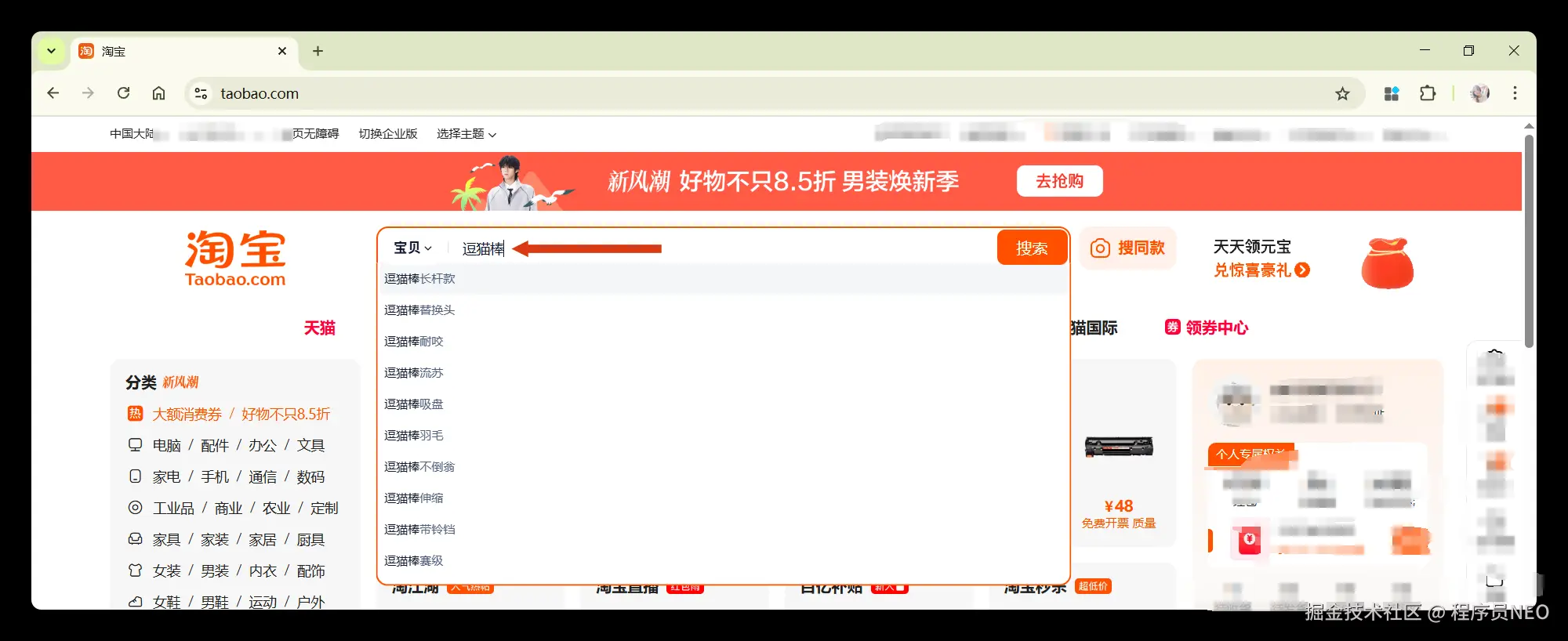成功进入淘宝网站,注意查看我截图中的网站是已经登录过的,我的登录状态仍然可以继续使用,接下来就可以继续执行下一步了,首先对网页元素进行解析: