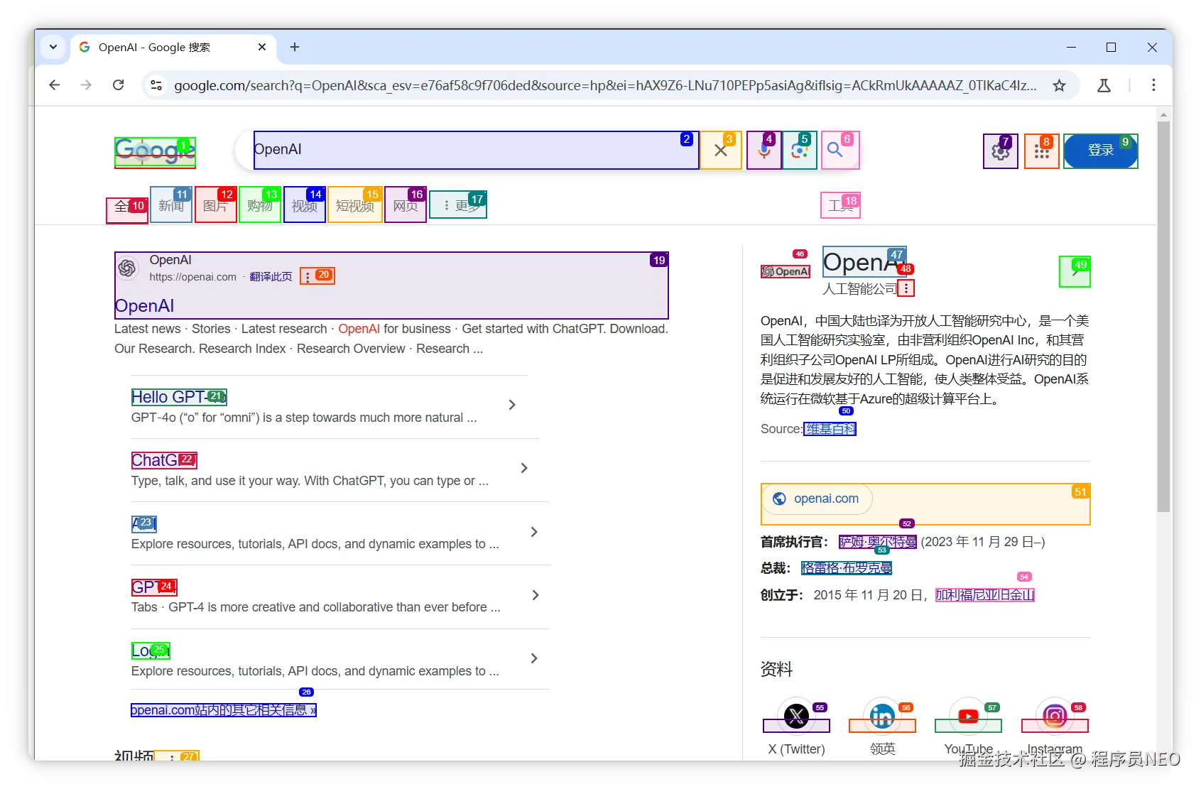 项目会对每个可互动元素进行彩色标注,自动填入 OpenAI 并点击搜索按钮: