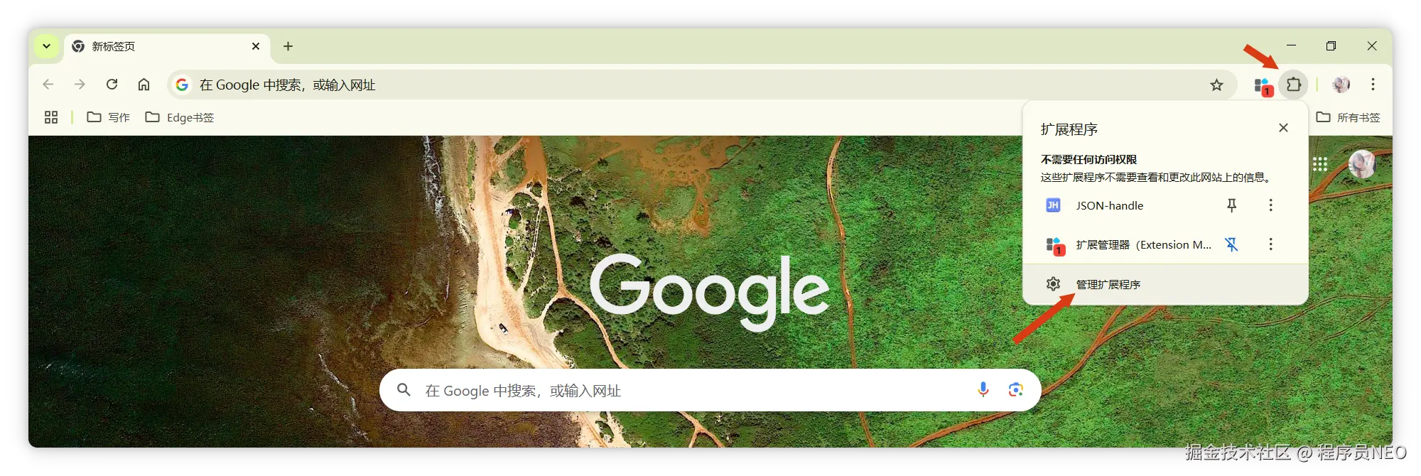 因为我测试下来这种方法更稳定,效果更好。操作如下:点击浏览器右上角的扩展,点击管理扩展: