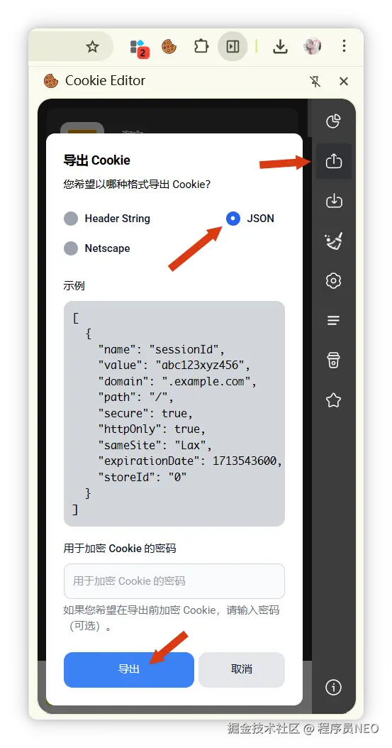 在 Cookie Editor 中点击 Export,导出当前网站的 Cookie 信息,导出格式选择 JSON 格式: