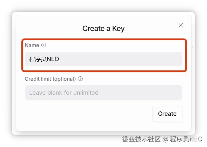 点击 Create Key 创建新 API Key:
