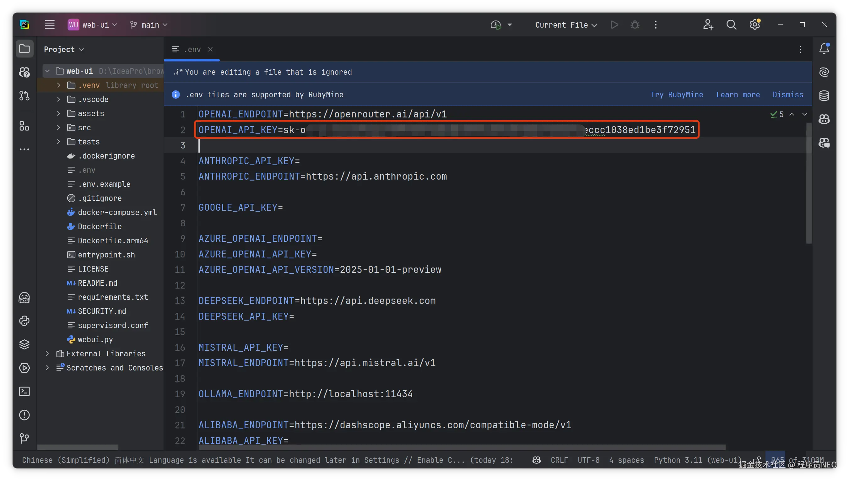 填写到项目配置文件 OPENAI_API_KEY 一行: